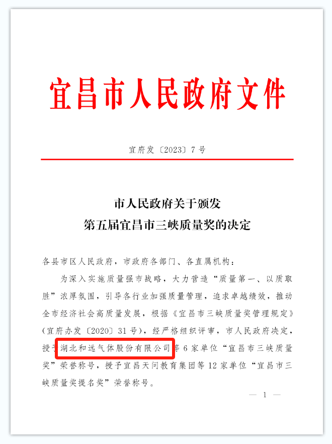 喜報!和遠氣體榮獲第五屆“宜昌市三峽質量獎”